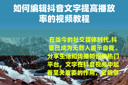 在当今的社交媒体时代,抖音已成为无数人展示自我、分享生活和传播知识的热门平台,文字在抖音视频中起着至关重要的作用,它能够吸引观众的注意力、传达关键信息并引发情感共鸣,从而有效提高视频的播放率,以下是一份关于如何编辑抖音文字以提高播放率的详细视频教程。