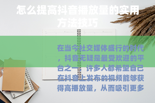 在当今社交媒体盛行的时代,抖音无疑是最受欢迎的平台之一,许多人都希望自己在抖音上发布的视频能够获得高播放量,从而吸引更多的关注和粉丝,怎么提高抖音播放量呢?以下是一些实用的方法技巧。 是关键,要确保你的视频内容具有吸引力和独特性,可以从热门话题入手,结合自己的风格和特长,制作出有趣、有用或有情感共鸣的视频,如果你擅长烹饪,那么可以制作各种美味菜肴的烹饪教程;如果你是个旅行爱好者,就分享你的旅行经历和见闻,这样的内容能够吸引到特定的受众群体,增加视频的播放量。