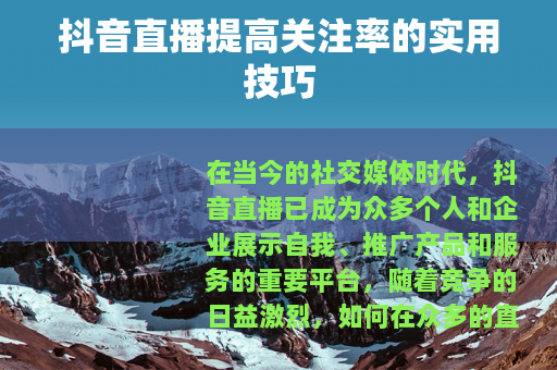 提高抖音直播的关注率需要在直播前、直播中、直播后各个环节都下功夫,不断优化和改进自己的直播策略和方法,通过以上实用技巧的应用,相信您一定能够在抖音直播中吸引更多的关注,实现自己的直播目标。