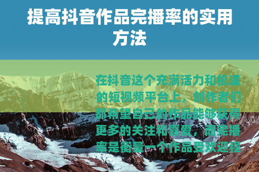 提高抖音作品的完播率需要从多个方面入手,不断优化视频的内容、制作技巧和发布策略等,才能让你的作品在抖音的海量视频中脱颖而出,获得更多用户的喜爱和关注,实现自己在抖音平台上的创作价值。