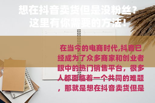 在当今的电商时代,抖音已经成为了众多商家和创业者眼中的热门销售平台,很多人都面临着一个共同的难题,那就是想在抖音卖货但是没粉丝,这确实是一个令人头疼的问题,但不要担心,只要掌握了正确的方法,你依然可以在抖音上实现自己的卖货梦想。