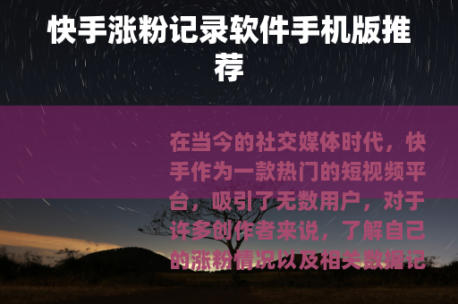 在当今的社交媒体时代,快手作为一款热门的短视频平台,吸引了无数用户,对于许多创作者来说,了解自己的涨粉情况以及相关数据记录是非常重要的,这有助于他们更好地调整创作策略,提升自己在平台上的影响力,而快手涨粉记录软件手机版的出现,为创作者们提供了极大的便利。