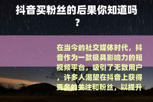 在当今的社交媒体时代,抖音作为一款极具影响力的短视频平台,吸引了无数用户,许多人渴望在抖音上获得更多的关注和粉丝,以提升自己的影响力和知名度,一些人可能会动起歪脑筋,想到通过购买粉丝来快速增加自己的粉丝数量,但这种看似捷径的做法,其实隐藏着诸多严重的后果。