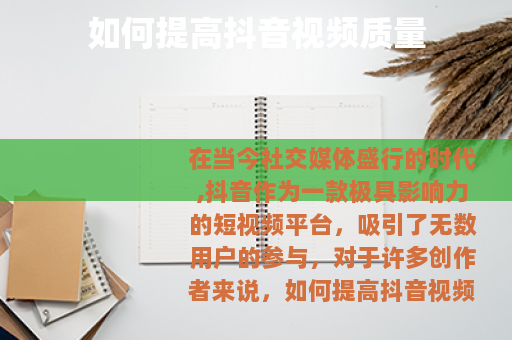 提高抖音视频质量需要从多个方面入手,包括选题、拍摄、剪辑、文案等,只有不断努力和实践,才能创作出高质量的抖音视频,在抖音的世界里展现自己的风采,获得更多的认可和喜爱。