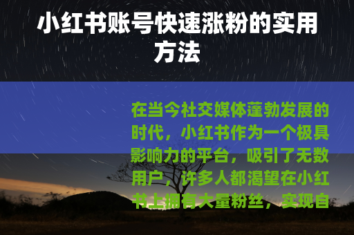 在当今社交媒体蓬勃发展的时代,小红书作为一个极具影响力的平台,吸引了无数用户,许多人都渴望在小红书上拥有大量粉丝,实现自己的社交价值和商业目标,小红书账号如何快速涨粉呢?以下是一些实用的方法。