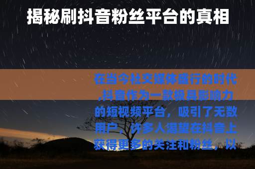 在当今社交媒体盛行的时代,抖音作为一款极具影响力的短视频平台,吸引了无数用户,许多人渴望在抖音上获得更多的关注和粉丝,以提升自己的影响力和知名度,刷抖音粉丝平台应运而生。