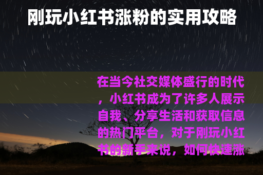 在当今社交媒体盛行的时代,小红书成为了许多人展示自我、分享生活和获取信息的热门平台,对于刚玩小红书的新手来说,如何快速涨粉是大家都非常关心的问题,以下是一些切实可行的方法,帮助你在小红书上开启涨粉之旅。