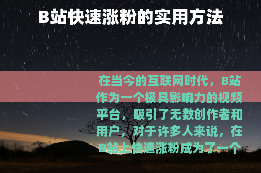 在当今的互联网时代,B站作为一个极具影响力的视频平台,吸引了无数创作者和用户,对于许多人来说,在B站上快速涨粉成为了一个重要的目标,如何才能在B站实现快速涨粉呢?以下是一些实用的方法。 质量是关键,要制作出高质量、有吸引力的视频内容,这意味着你需要有独特的创意和观点,能够在众多的视频中脱颖而出,无论是有趣的搞笑视频、专业的知识讲解,还是精彩的生活记录,都要确保内容能够真正吸引观众的兴趣,让他们愿意花时间观看你的视频,并且看完后还能有所收获或感到愉悦。