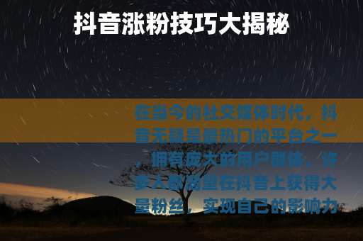 在当今的社交媒体时代,抖音无疑是最热门的平台之一,拥有庞大的用户群体,许多人都渴望在抖音上获得大量粉丝,实现自己的影响力和价值,下面就为大家分享一些实用的抖音涨粉技巧。 创作是关键,要确保你的视频内容具有独特性和吸引力,可以从自身的兴趣爱好、特长出发,挖掘一些与众不同的主题,如果你擅长烹饪,那就可以制作各种精美的美食制作视频,详细展示每一个步骤和独特的烹饪技巧,让观众在观看的过程中不仅能学到东西,还能感受到美食的魅力,要注意视频的趣味性,通过幽默的语言、有趣的情节设置等方式,让观众在轻松愉快的氛围中观看视频,从而更容易产生共鸣和关注。