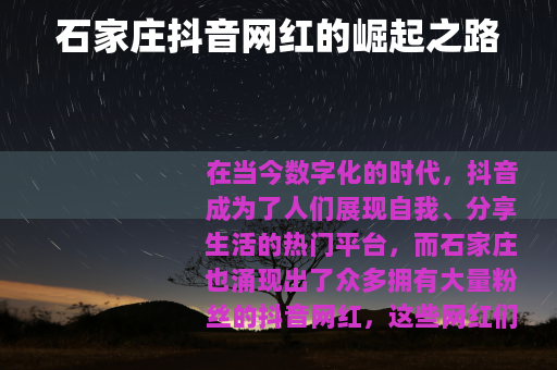在未来,相信石家庄的抖音网红们会继续在这个充满机遇的平台上发光发热,创造出更多精彩的内容,为石家庄的发展注入新的活力。 能满足你的需求,你可以根据实际情况进行调整和修改,如果你还有其他问题,欢迎继续向我提问。