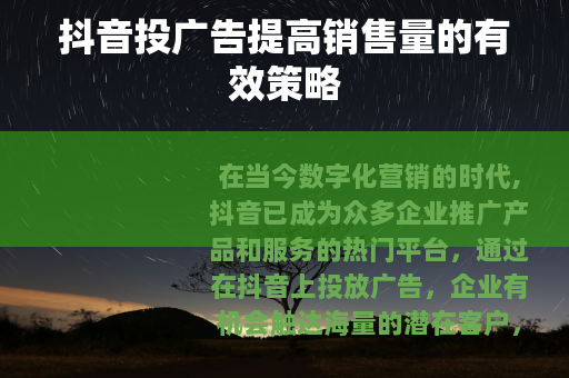 在当今数字化营销的时代,抖音已成为众多企业推广产品和服务的热门平台,通过在抖音上投放广告,企业有机会触达海量的潜在客户,从而实现销售量的显著增长,如何在抖音投广告提高销售量呢?以下是一些经过实践验证的有效策略。