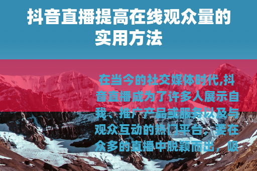 在当今的社交媒体时代,抖音直播成为了许多人展示自我、推广产品或服务以及与观众互动的热门平台,要在众多的直播中脱颖而出,吸引大量的在线观众并非易事,以下是一些关于抖音直播如何提高在线观众量的有效方法。 的策划至关重要,要明确自己的直播定位和目标受众,根据受众的兴趣和需求来设计直播内容,如果你擅长烹饪,那么可以策划一系列的美食制作直播,分享独特的食谱和烹饪技巧,在内容上保持新颖和有趣,不断给观众带来新鲜感,这样才能吸引他们持续关注你的直播。