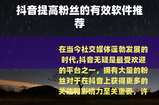 在当今社交媒体蓬勃发展的时代,抖音无疑是最受欢迎的平台之一,拥有大量的粉丝对于在抖音上获得更多的关注和影响力至关重要,许多人都在寻找能够帮助他们提高抖音粉丝数量的软件,今天就来给大家介绍几款实用的抖音提高粉丝的软件。