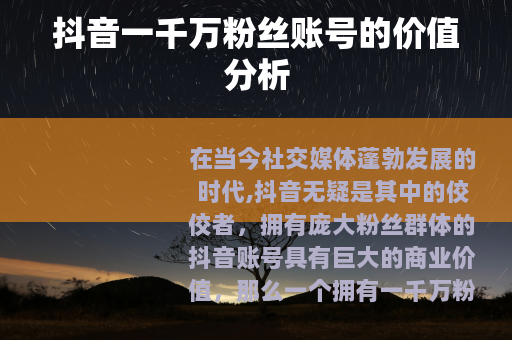 我们要明白抖音账号的价值是由多个因素共同决定的,粉丝数量是一个重要的考量指标,但绝不是唯一的标准,一千万粉丝的账号意味着拥有广泛的受众基础,能够在平台上产生较大的影响力,当发布一条视频时,会有大量的用户看到,这对于品牌推广和产品营销来说是非常有吸引力的。