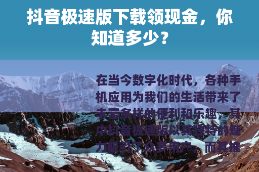 在当今数字化时代,各种手机应用为我们的生活带来了丰富多样的便利和乐趣,其中抖音极速版以其独特的魅力吸引了众多用户,而其推出的下载领现金活动,更是引发了广泛的关注和参与热潮。