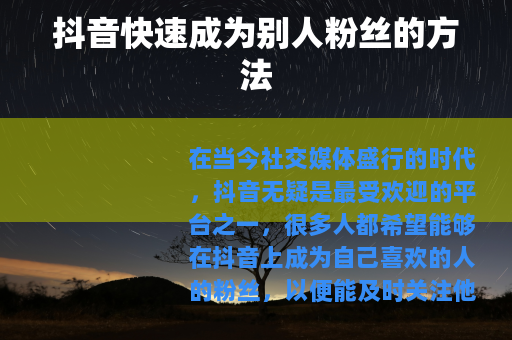 在当今社交媒体盛行的时代,抖音无疑是最受欢迎的平台之一,很多人都希望能够在抖音上成为自己喜欢的人的粉丝,以便能及时关注他们的动态,那么抖音怎么变成别人的粉丝呢?下面就为大家介绍几种简单有效的方法。