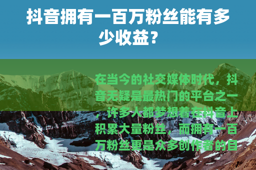 在当今的社交媒体时代,抖音无疑是最热门的平台之一,许多人都梦想着在抖音上积累大量粉丝,而拥有一百万粉丝更是众多创作者的目标,当在抖音上拥有一百万粉丝时,究竟能赚多少钱呢?