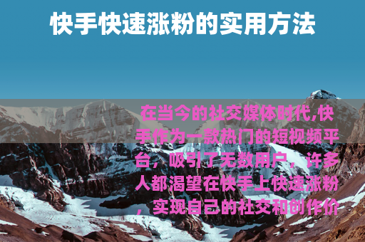 在当今的社交媒体时代,快手作为一款热门的短视频平台,吸引了无数用户,许多人都渴望在快手上快速涨粉,实现自己的社交和创作价值,以下是一些可以帮助你在快手快速涨粉的有效方法。 是关键,你需要确保自己发布的视频具有独特性和吸引力,可以从自己的兴趣爱好、特长技能出发,制作出能够展现个性和专业度的视频,如果你擅长烹饪,那么可以制作一系列精美的美食制作视频,详细展示食材准备、烹饪步骤以及最终的美味成品,让观众在观看过程中不仅能学到烹饪技巧,还能感受到美食带来的诱惑,如果你有表演天赋,那么可以拍摄一些有趣的短剧或小品,通过精彩的剧情和生动的表演吸引观众的眼球,引发他们的共鸣和喜爱。