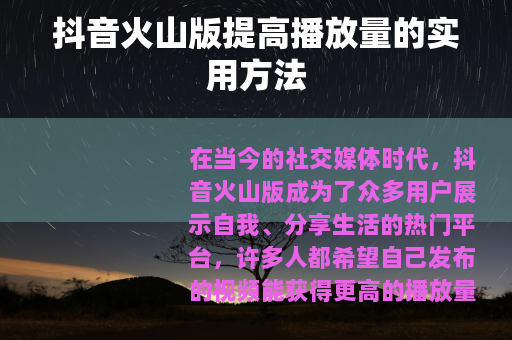 在当今的社交媒体时代,抖音火山版成为了众多用户展示自我、分享生活的热门平台,许多人都希望自己发布的视频能获得更高的播放量,从而吸引更多的关注和粉丝,抖音火山版怎么提高播放量呢?以下是一些实用的方法。 质量是关键,要确保你的视频内容具有吸引力和独特性,可以从自身的兴趣和特长出发,制作出有创意、有趣味或者有价值的视频,如果你擅长烹饪,那么可以制作精美的美食制作教程;如果你有表演天赋,就可以拍摄一些搞笑短剧或才艺展示视频,当你的内容能够真正满足用户的某种需求,无论是娱乐、知识获取还是情感共鸣,都更容易引发他们的关注和分享,进而提高播放量。