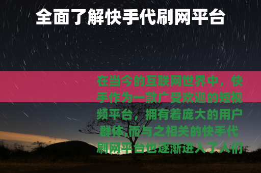 在当今的互联网世界中,快手作为一款广受欢迎的短视频平台,拥有着庞大的用户群体,而与之相关的快手代刷网平台也逐渐进入了人们的视野。