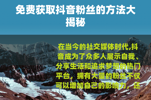 在当今的社交媒体时代,抖音成为了众多人展示自我、分享生活和追求梦想的热门平台,拥有大量的粉丝不仅可以增加自己的影响力,还能为个人或品牌带来更多的机会,很多人都在思考一个问题:不要钱抖音怎么刷粉丝呢?
