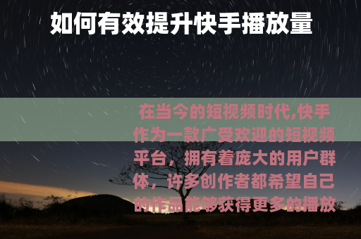 提升快手播放量需要从多个方面入手,不断优化自己的内容和创作技巧,积极利用平台的各种资源和功能,才能在激烈的竞争中脱颖而出,让自己的视频获得更多的关注和播放量。