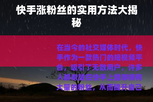 在当今的社交媒体时代,快手作为一款热门的短视频平台,吸引了无数用户,许多人都希望在快手上能够拥有大量的粉丝,从而提升自己的影响力和知名度,以下是一些快手涨粉丝的有效方法。