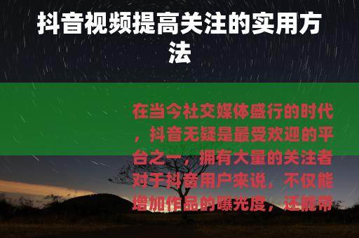 在当今社交媒体盛行的时代,抖音无疑是最受欢迎的平台之一,拥有大量的关注者对于抖音用户来说,不仅能增加作品的曝光度,还能带来更多的互动和机会,抖音视频怎么提高关注呢?以下是一些实用的方法。