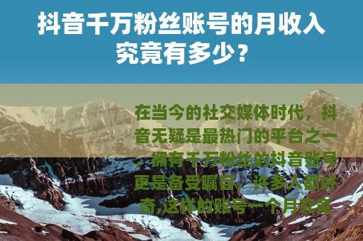 在当今的社交媒体时代,抖音无疑是最热门的平台之一,拥有千万粉丝的抖音账号更是备受瞩目,许多人都好奇,这样的账号一个月究竟能收入多少呢?
