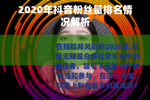 虽然很难确切地说谁就是2020年抖音粉丝最多的那一个人,因为粉丝数量在不断变化,而且不同的统计时间点可能会有不同的结果,但这些在抖音上拥有大量粉丝的创作者们,都以自己的方式为平台增添了光彩,也为用户们带来了丰富多样的娱乐和知识体验,他们的成功也激励着更多的人来到抖音,展示自己的才华,追求自己的梦想,共同创造出一个更加丰富多彩的抖音世界。 仅为示例,你可以根据实际情况对具体名字和相关描述进行修改完善,使其更符合真实的抖音粉丝情况。