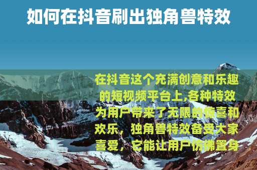 在抖音刷出独角兽特效并不难,只要你熟悉平台的操作流程,善于探索和尝试,就能轻松制作出属于自己的独角兽特效视频,为自己的抖音生活增添更多的色彩和乐趣。