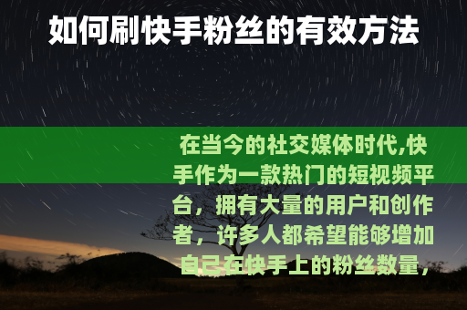 在当今的社交媒体时代,快手作为一款热门的短视频平台,拥有大量的用户和创作者,许多人都希望能够增加自己在快手上的粉丝数量,以获得更多的关注和影响力,以下是一些关于如何刷快手粉丝的有效方法。