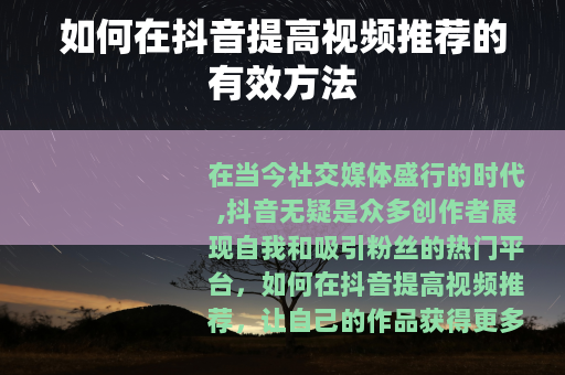 通过以上这些方法的综合运用,相信在抖音提高视频推荐并不是一件难事,只要不断努力和尝试,每个创作者都有机会让自己的作品在抖音这个大舞台上获得更多的关注和喜爱。
