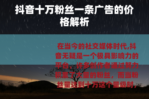 在当今的社交媒体时代,抖音无疑是一个极具影响力的平台,许多创作者通过努力积累了大量的粉丝,而当粉丝量达到十万这个量级时,广告商们往往会对其产生浓厚的兴趣,抖音十万粉丝一条广告究竟能值多少钱呢?