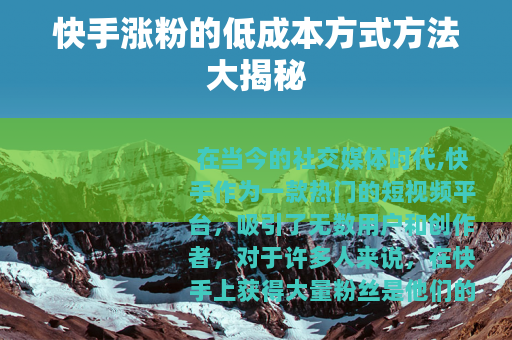在当今的社交媒体时代,快手作为一款热门的短视频平台,吸引了无数用户和创作者,对于许多人来说,在快手上获得大量粉丝是他们的目标之一,而如何以最低的成本实现涨粉就成了大家关注的焦点。
