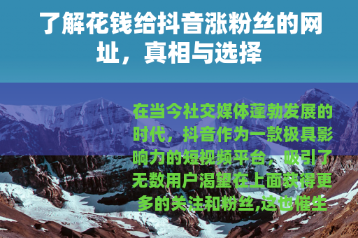 在当今社交媒体蓬勃发展的时代,抖音作为一款极具影响力的短视频平台,吸引了无数用户渴望在上面获得更多的关注和粉丝,这也催生了一些声称可以花钱给抖音涨粉丝的网址在网络上出现。