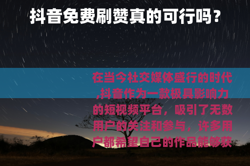 在当今社交媒体盛行的时代,抖音作为一款极具影响力的短视频平台,吸引了无数用户的关注和参与,许多用户都希望自己的作品能够获得更多的点赞,从而提高曝光度和影响力。“抖音免费刷赞”这样的话题便应运而生,引发了众多用户的好奇与探索欲望。