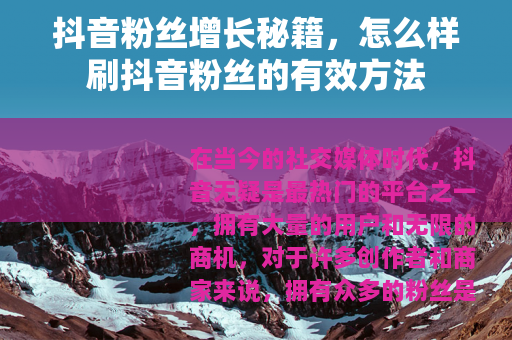 在当今的社交媒体时代,抖音无疑是最热门的平台之一,拥有大量的用户和无限的商机,对于许多创作者和商家来说,拥有众多的粉丝是实现自己目标的关键,怎么样刷抖音粉丝呢?下面就为大家分享一些实用的方法。