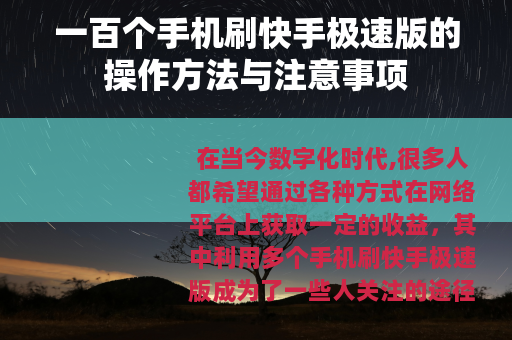 在当今数字化时代,很多人都希望通过各种方式在网络平台上获取一定的收益,其中利用多个手机刷快手极速版成为了一些人关注的途径,以下为大家详细介绍一百个手机刷快手极速版的相关内容。