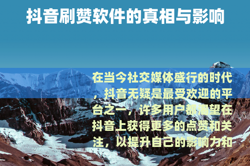 在当今社交媒体盛行的时代,抖音无疑是最受欢迎的平台之一,许多用户都渴望在抖音上获得更多的点赞和关注,以提升自己的影响力和知名度,有一种现象引起了人们的广泛关注,那就是刷赞软件在抖音上的出现。
