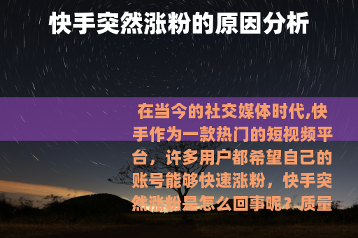 在当今的社交媒体时代,快手作为一款热门的短视频平台,许多用户都希望自己的账号能够快速涨粉,快手突然涨粉是怎么回事呢? 质量是关键因素之一,如果你的视频内容具有独特性、趣味性、实用性或情感共鸣性,就更容易吸引观众的关注,制作精美的美食视频,详细展示烹饪过程和独特的配方,能满足美食爱好者的需求;或者是搞笑幽默的短剧,能让用户在忙碌的生活中得到放松和欢乐,这样的内容往往会获得较高的点赞和分享,从而吸引更多的粉丝。