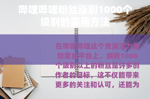 在哔哩哔哩这个充满活力和创意的平台上,拥有1000个级别以上的粉丝是许多创作者的目标,这不仅能带来更多的关注和认可,还能为创作之路增添更多的可能性,如何才能让自己在哔哩哔哩的粉丝涨到1000个级别呢?以下是一些实用的方法。