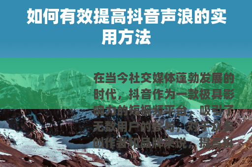 提高抖音声浪需要从多个方面入手,不断优化内容和运营策略,通过持续的努力和创新,才能在竞争激烈的抖音平台上取得更好的成绩,让自己的声音被更多人听到。
