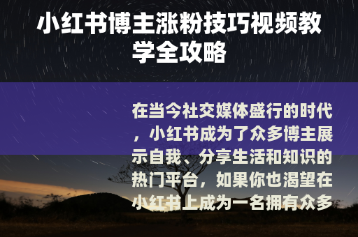 在当今社交媒体盛行的时代,小红书成为了众多博主展示自我、分享生活和知识的热门平台,如果你也渴望在小红书上成为一名拥有众多粉丝的博主,那么掌握一些有效的涨粉技巧是至关重要的,以下是为您精心准备的小红书博主涨粉技巧视频教学全攻略。 创作是关键,要确保你的视频内容具有独特性和吸引力,可以从自身的兴趣爱好、专业知识或擅长的领域出发,制作出有价值、有趣味的视频,如果你擅长烹饪,那么可以制作一系列精美的美食制作视频,详细展示每一道菜肴的制作过程和独特的烹饪技巧,让观众在观看的过程中不仅能够学到知识,还能感受到烹饪的乐趣。