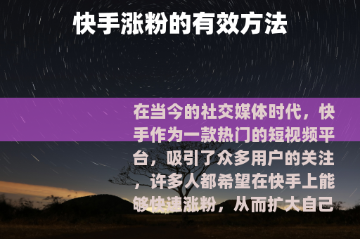 在当今的社交媒体时代,快手作为一款热门的短视频平台,吸引了众多用户的关注,许多人都希望在快手上能够快速涨粉,从而扩大自己的影响力和获得更多的机会,以下是一些快手涨粉的有效方法。