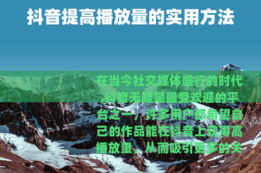 在当今社交媒体盛行的时代,抖音无疑是最受欢迎的平台之一,许多用户都希望自己的作品能在抖音上获得高播放量,从而吸引更多的关注和粉丝,抖音怎么把播放量提高呢?以下是一些实用的方法。 质量是关键,要确保你的视频内容具有独特性、趣味性和实用性,独特的内容能够让用户在众多视频中眼前一亮,趣味性则可以吸引用户停留观看,而实用性的内容会让用户觉得有价值,从而更愿意分享,你可以分享一些生活小窍门、美食制作教程、时尚穿搭技巧等,这些都是用户比较感兴趣的话题。