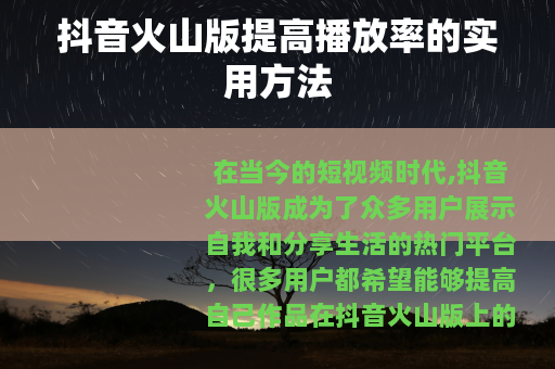 在当今的短视频时代,抖音火山版成为了众多用户展示自我和分享生活的热门平台,很多用户都希望能够提高自己作品在抖音火山版上的播放率,却常常感到无从下手,以下是一些有效的方法,可以帮助你在抖音火山版上获得更多的播放量。 是关键,要确保你的视频内容具有吸引力和独特性,可以从自己的兴趣爱好、专业技能或者生活中的趣事出发,制作出能够引起观众共鸣的视频,如果你擅长烹饪,那么可以制作一系列详细的美食制作教程,满足广大美食爱好者的需求;如果你有幽默风趣的性格,不妨拍摄一些搞笑短剧,让观众在忙碌的生活中能开怀大笑。