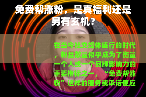 在当今社交媒体盛行的时代,粉丝数量似乎成为了衡量一个人或一个品牌影响力的重要指标之一。“免费帮涨粉”这样的服务或承诺便应运而生,吸引了众多渴望快速提升人气的用户的目光。