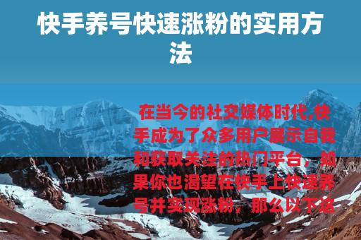 在当今的社交媒体时代,快手成为了众多用户展示自我和获取关注的热门平台,如果你也渴望在快手上快速养号并实现涨粉,那么以下这些实用方法值得你参考。