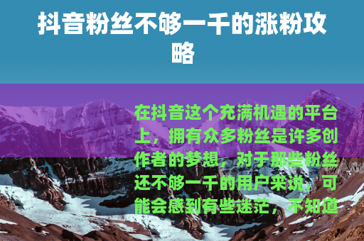 在抖音这个充满机遇的平台上,拥有众多粉丝是许多创作者的梦想,对于那些粉丝还不够一千的用户来说,可能会感到有些迷茫,不知道该如何有效涨粉,以下是一些实用的方法,帮助你在抖音上实现粉丝量的突破。